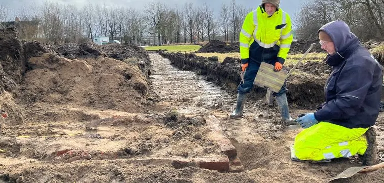 Her stødte på bygningsrester af munkesten. Det er en særlig type af mursten, der blev brugt i en periode fra 1100-tallet til 1600-tallet.