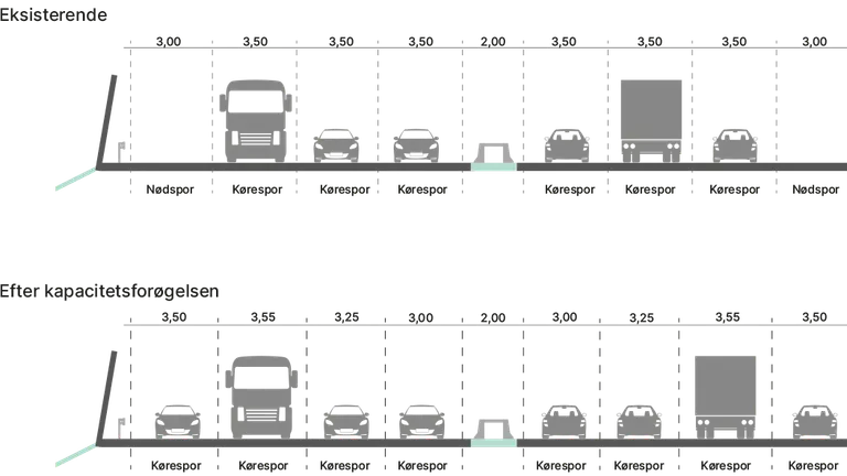 Det skal ske ved at udbygge motorvejen med et ekstra spor primært ved at inddrage nødsporet. Køresporene bliver mindre og hastigheden sættes ned til 90 km/t.