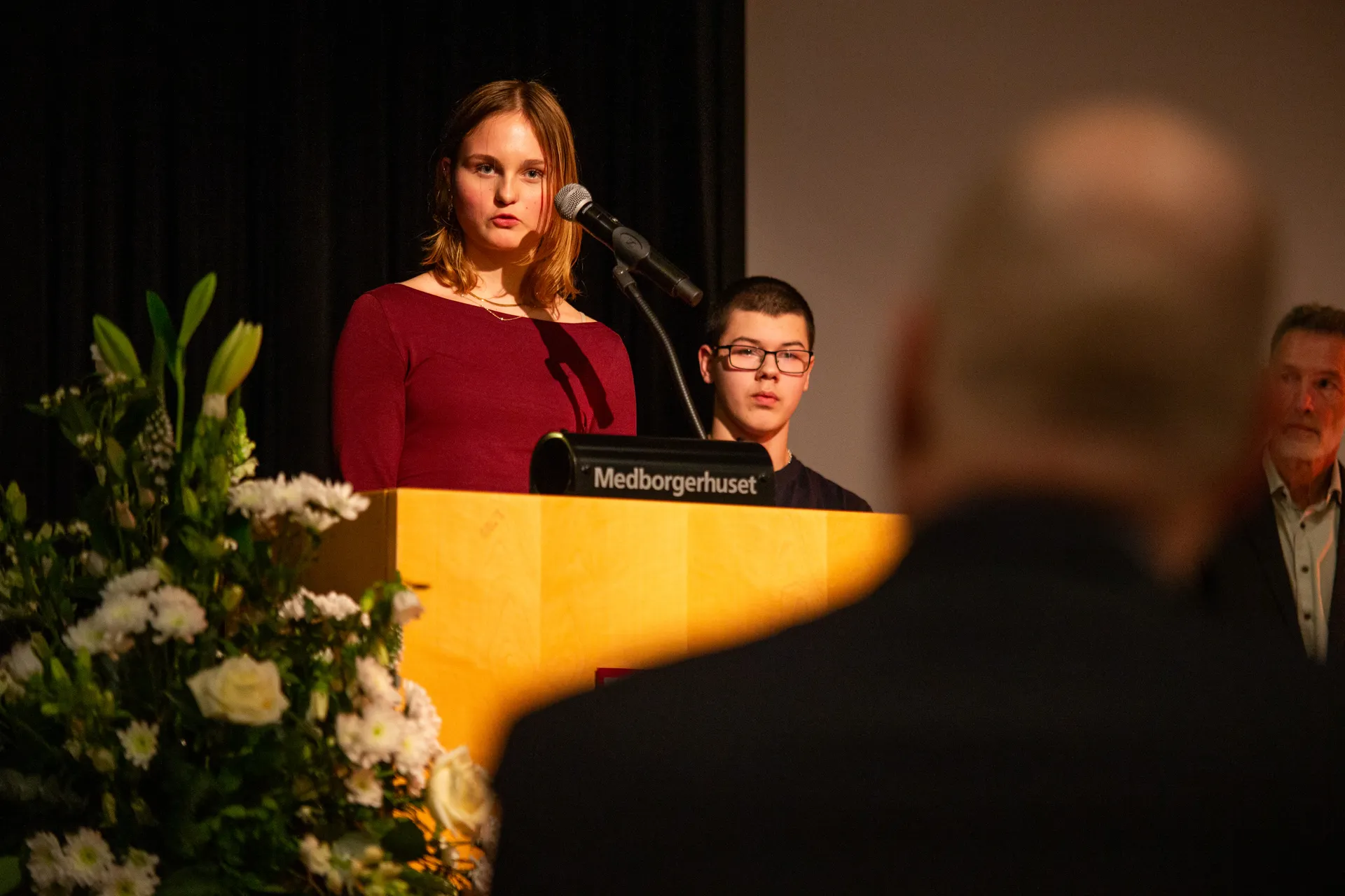 ”Ingen kan være i tvivl om, at børnene og folkeskolen betyder meget for Thomas”, sagde 1. viceborgmester Lars Mann, da han introducerede de næste talere – to elever fra Herlev Fælleselevråd, Naja og Oliver.