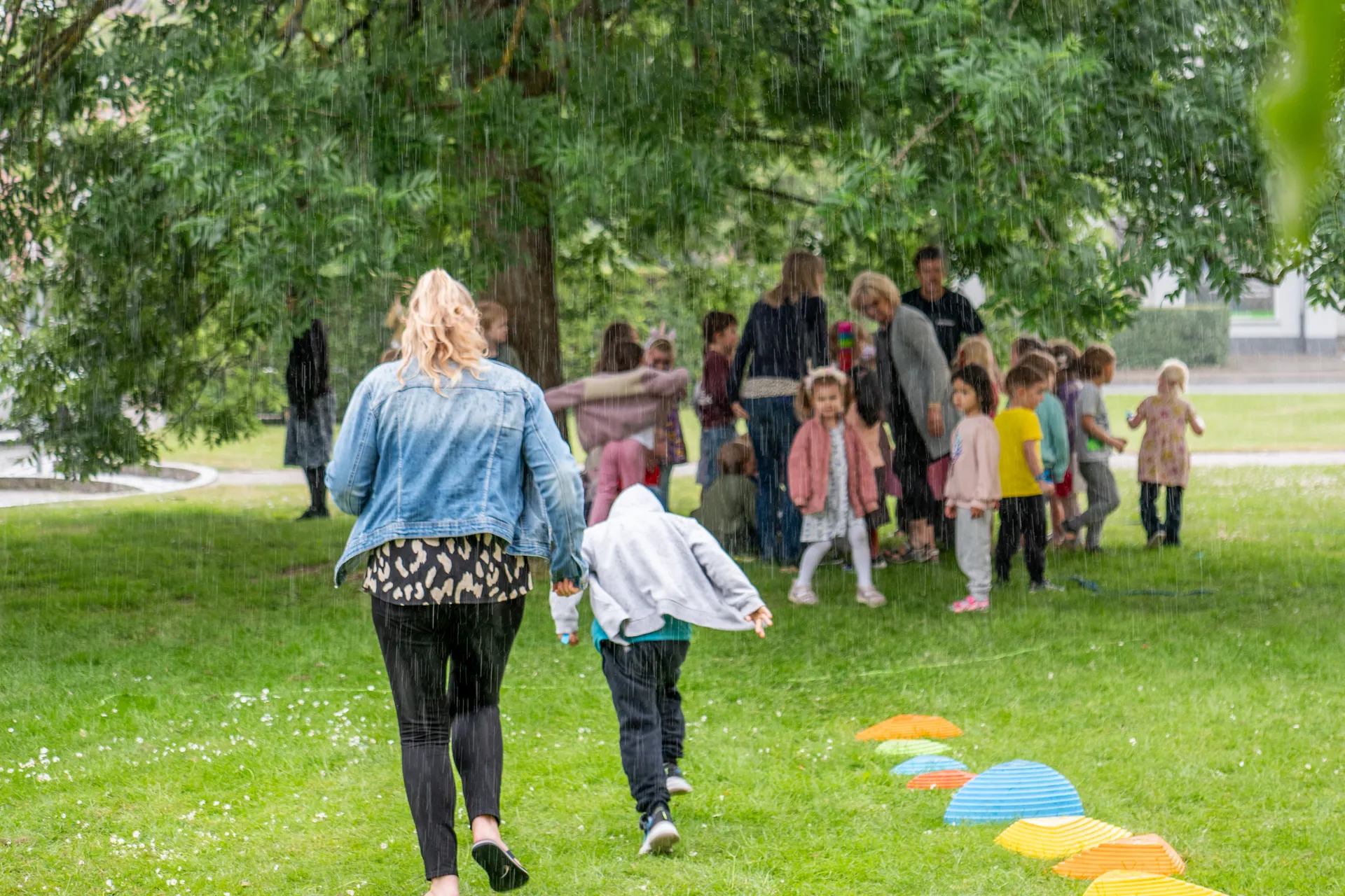 Heldigvis tog børnene regnskyllet med højt humør, og de børn, der var udenfor, da regnen satte ind, kom hurtigt ind i tørvejr.