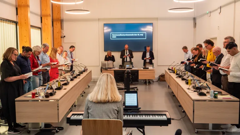 ”Det vil være sådan at kommunalbestyrelsesmedlemmerne er forpligtede til at synge med. For tilhørerne er det en mulighed, men vi vil sætte pris på det. Og eftersom alting bliver optaget, vil vi bagefter følge med i hvem der sang og hvem der ikke sang. Det vil vi glæde os til at følge med i på TV, når vi kommer hjem”, sagde borgmesteren med et smil.