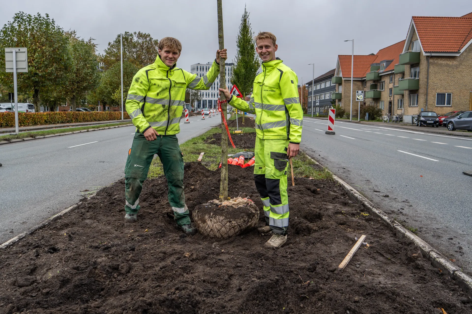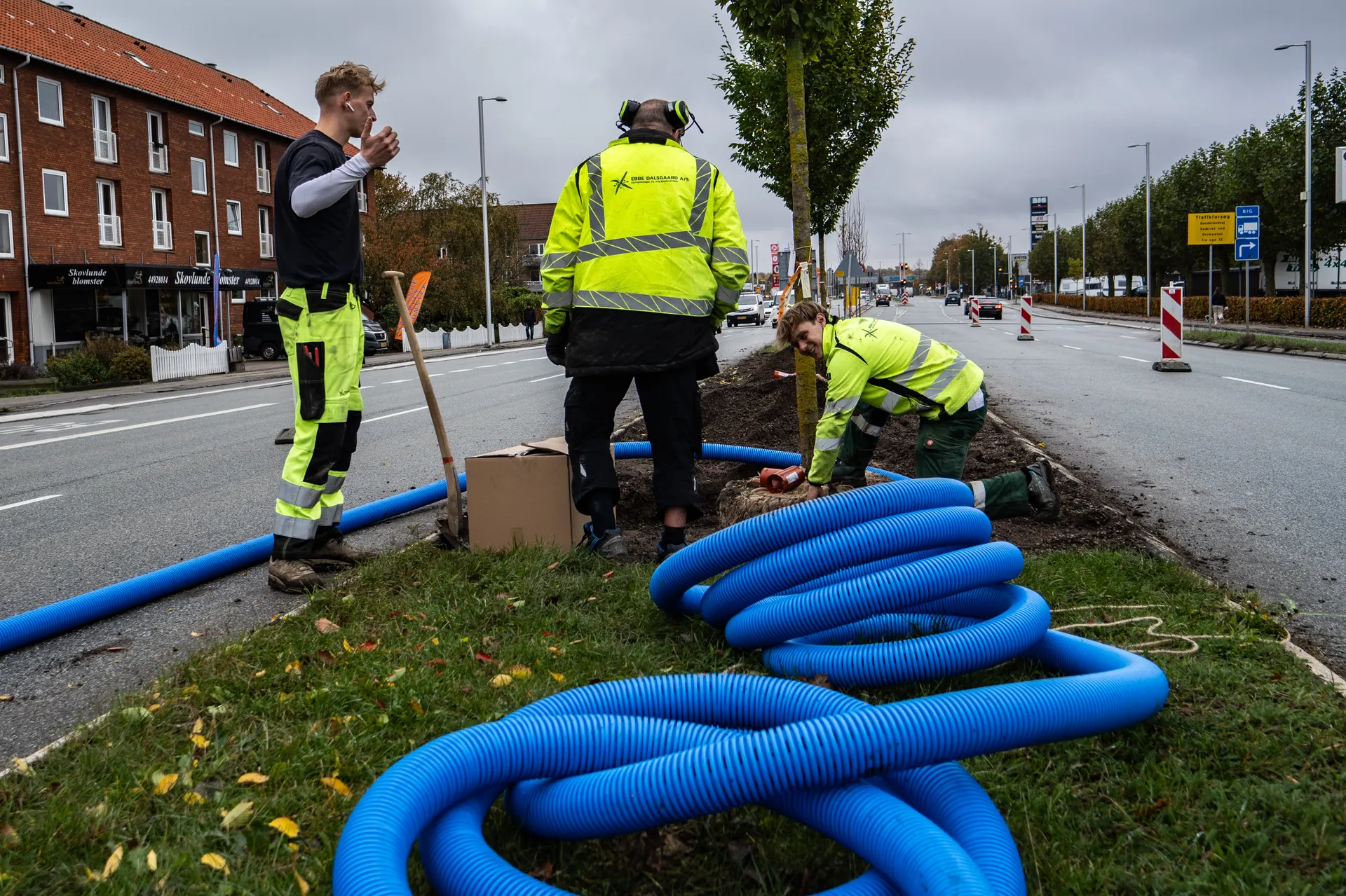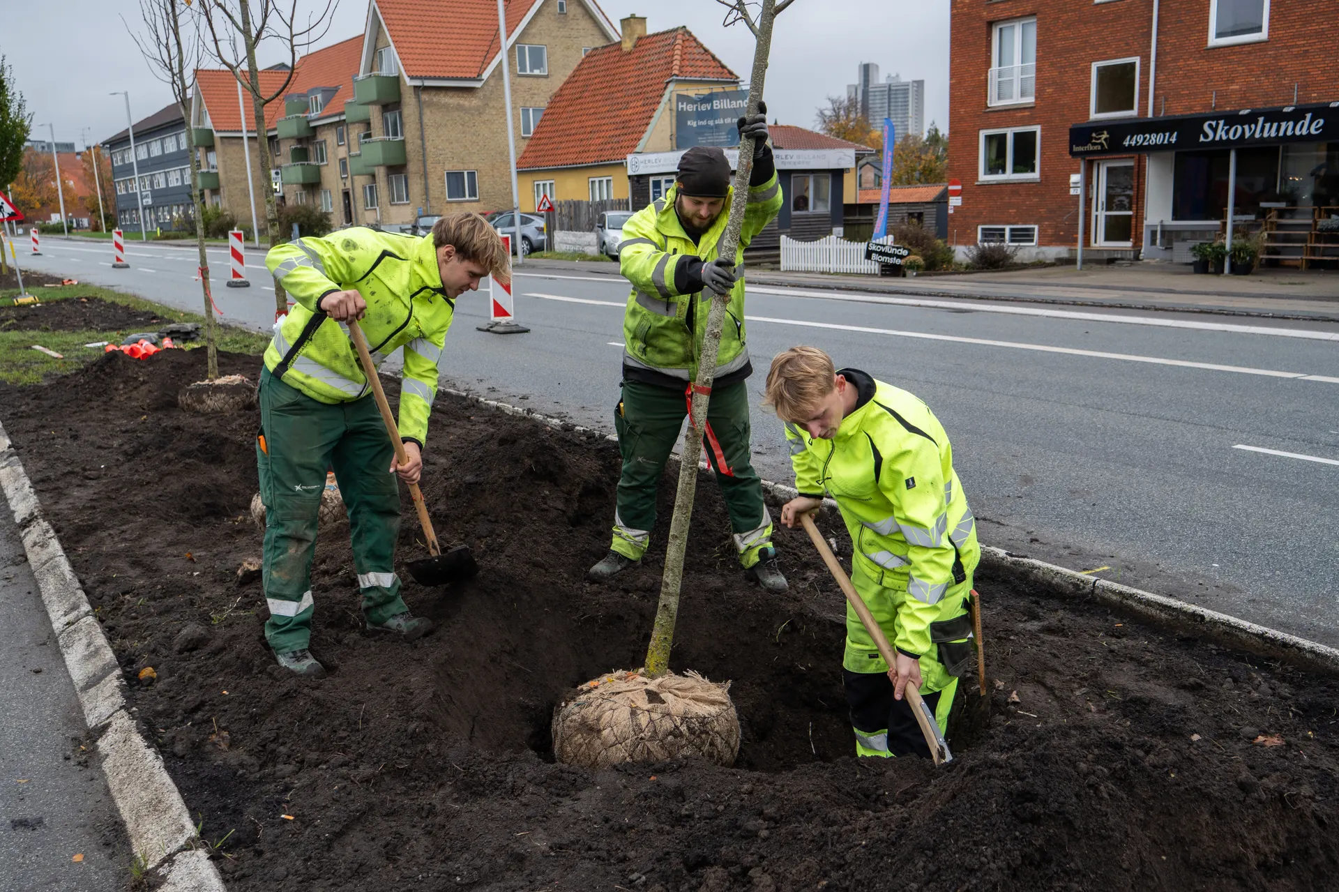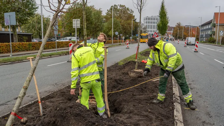 Lyset glimter i det blankslidte stål i spader og skovle. Gartnerne graver igennem i midterrabatten på Herlev Hovedgade. Spidsløn, søjleelm, småbladet lind og avnbøg er på vej i jorden. Rundt om rødderne lægger de blå slange, der skal bruges til vandingen. Nyplantede træer skal passes på og vandes godt de første år.