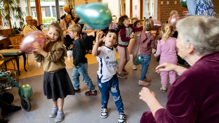 Smilene lyser i ansigterne på beboerne på Plejecenter Lærkegaard, der har besøg af deres legekammerater fra Børnehaven Mælkevejen.