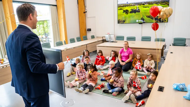 Den første børnehave kom allerede tidligt i morges for at hente en plakat, og netop nu er det børnene fra Børnehuset Kildespring-Eventyrhuset, som sidder i Rådhussalen og nyder popcornene og æblejuicen.