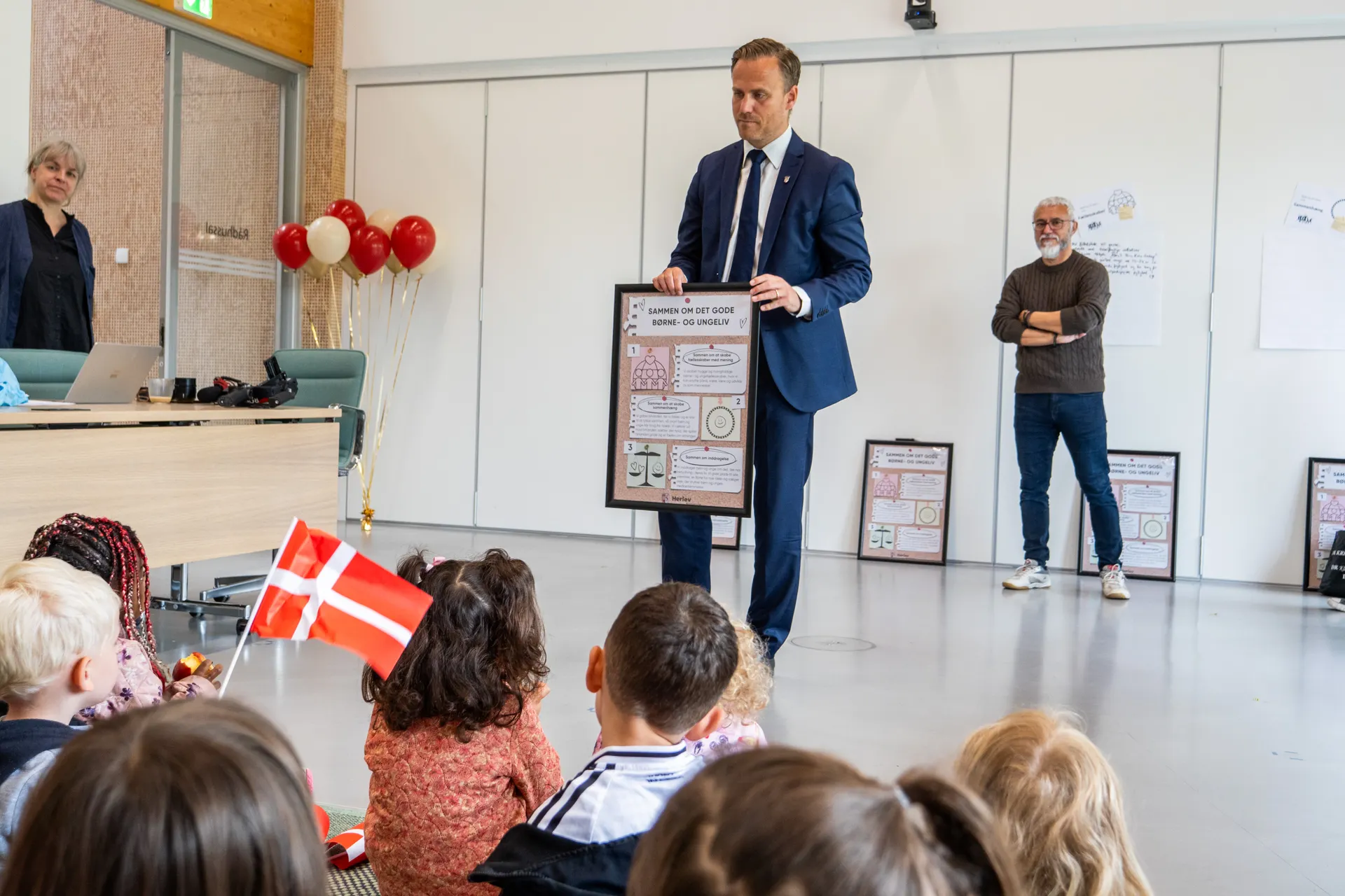 Borgmesteren er kommet forbi for selv at få fat i en udgave af Børne- og Ungepolitikken og hilse på dem det hele handler om – de mange børn i Herlev.