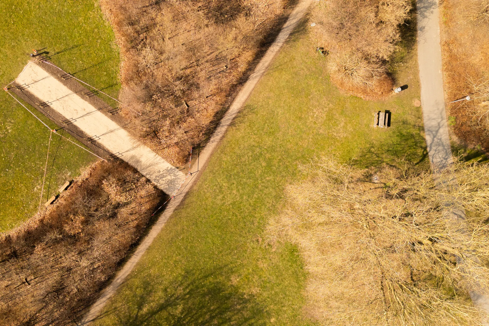 Solen skinner og kaster lange skygger på de nyopførte japanske piletræer, som står i en pæn række i Elverparken.