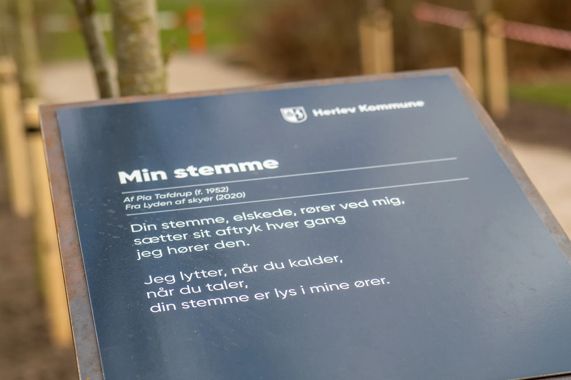 Derudover er der placeret en lille tavle med Pia Tafdrups digt ”Min Stemme”.