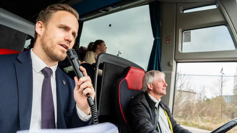 Her er det borgmester Marco Damgaard, der er guide og sidder ved mikrofonen, mens bussen glider rundt i byen forbi institutionerne, skolerne, kulturinstitutionerne, fritidslivet og alt det som gør Herlev til et helt særligt sted at være og arbejde.