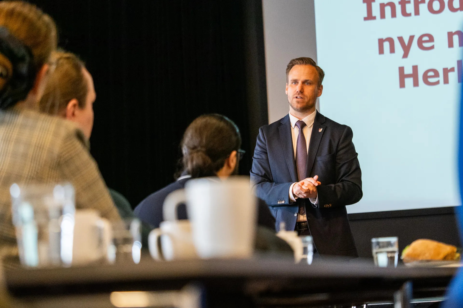 Her samles nye medarbejdere til en frokost i Herlev Medborgerhus, inden borgmester Marco Damgaard og Kommunaldirektør Jesper Zwisler tager ordet til en fortælling om, hvad Herlev er, og hvad der er vigtigt i det kommunale arbejde.