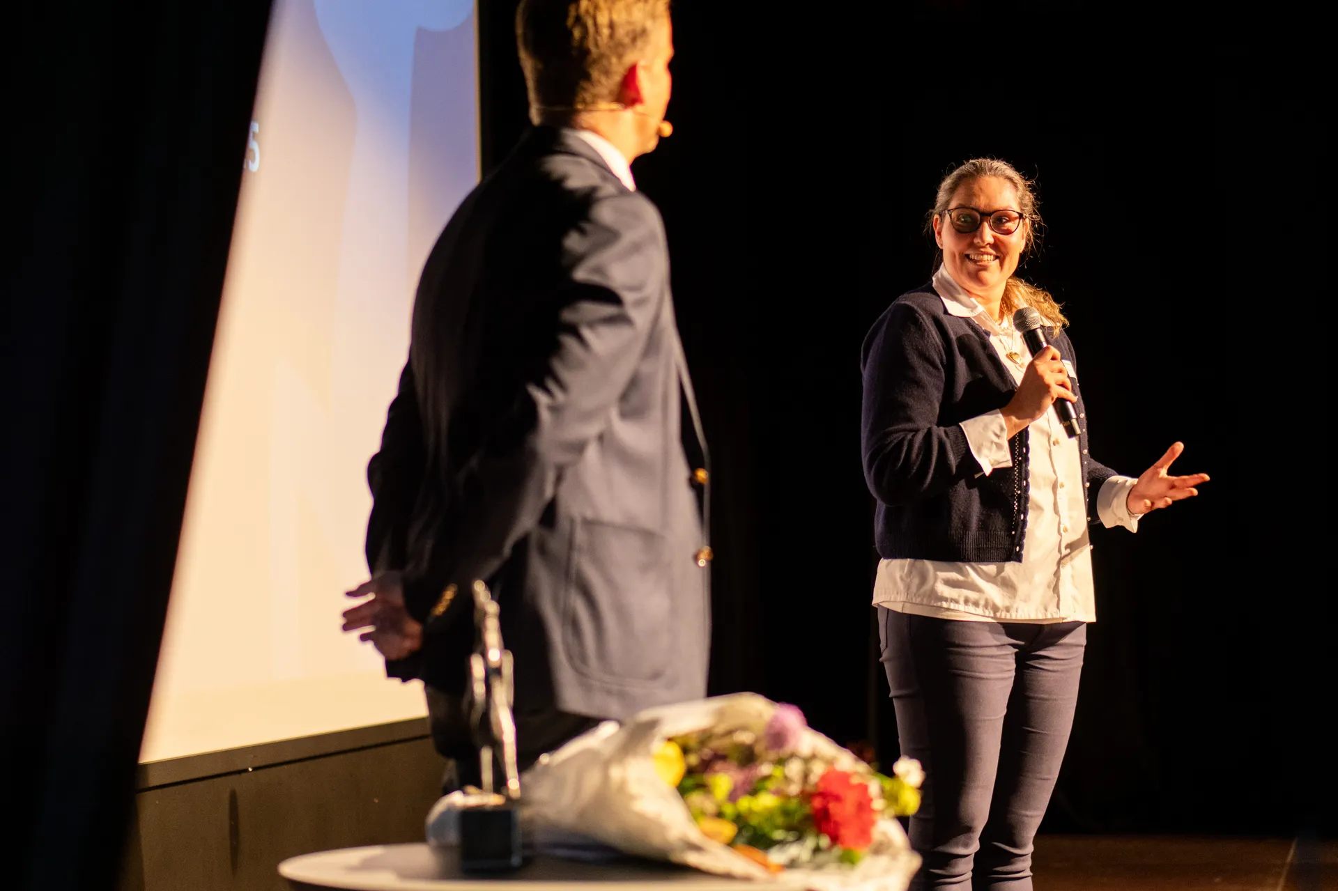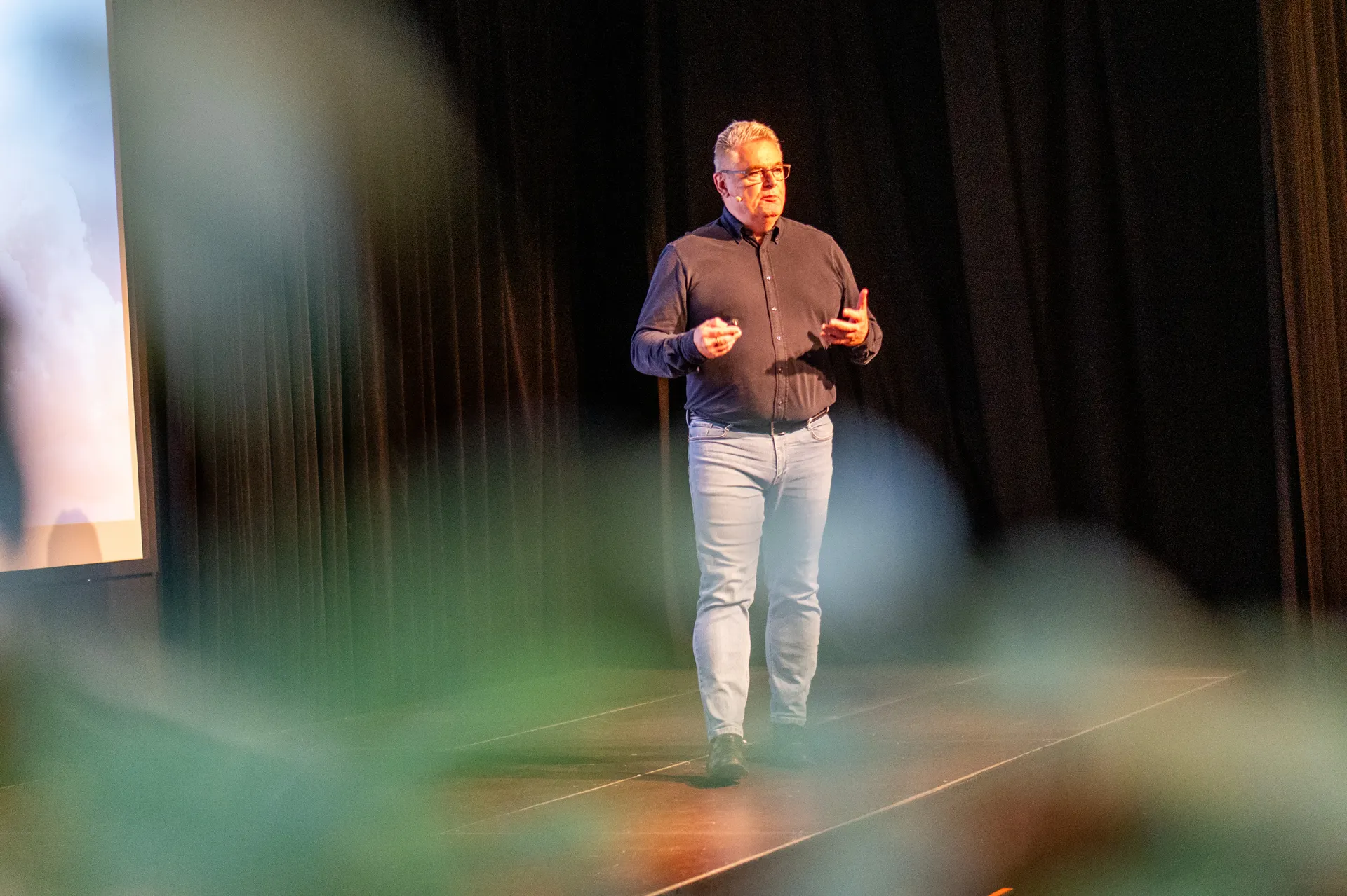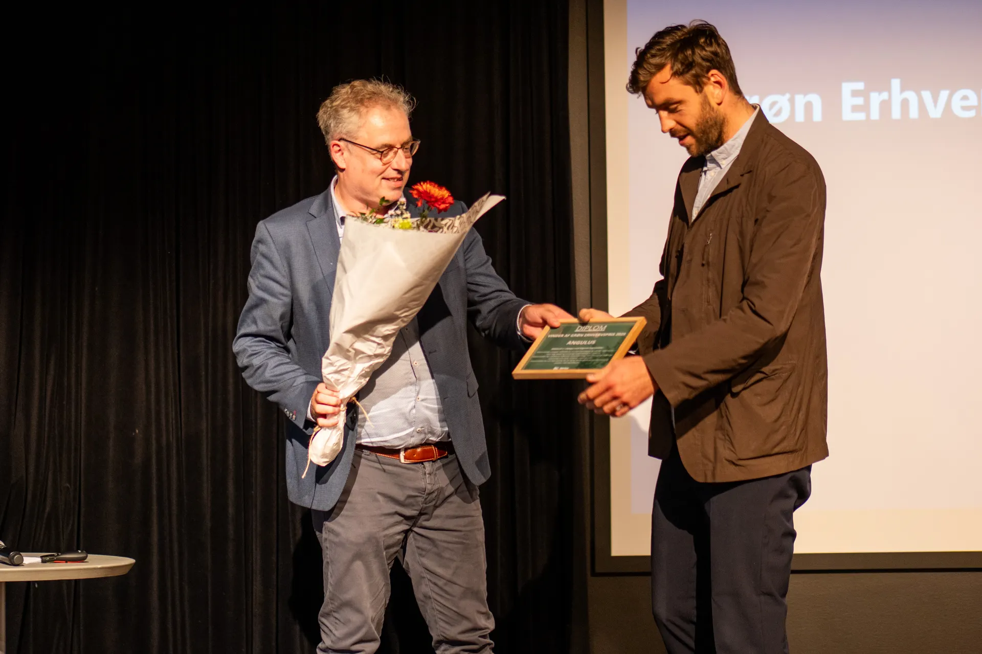 Nysgerrighed åbner døre, og den næste dør, som blev åbnet til aftenens dialogmøde, var uddelingen af Grøn Erhvervspris 2025, og her var det Sebastian Dawe, CEO hos Angulus sko, der kunne sætte fødderne på scenen og lade sig hylde for deres fokus på at skabe bæredygtighed og kompensere for det klimaaftryk, som deres produktion medfører.