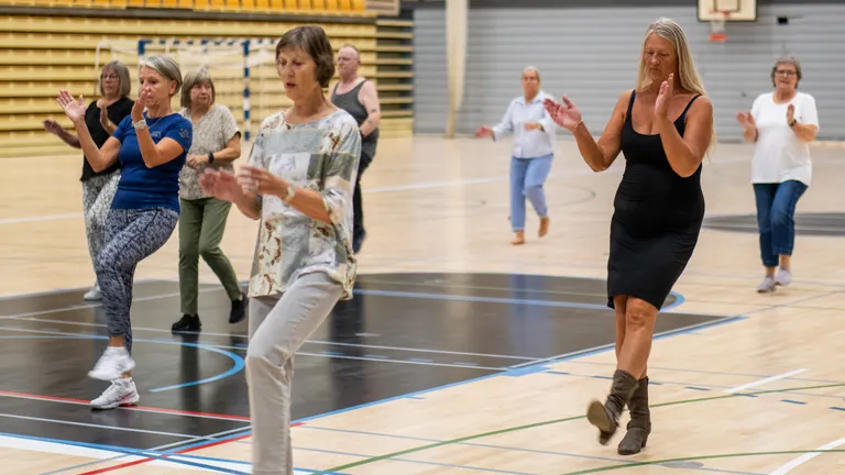 Der er gang i den på trægulvet i Herlev Hallen tirsdag formiddag. Formationsdansen kræver koncentration og koordination og deltagerne får sved på panden, og der bliver grinet.